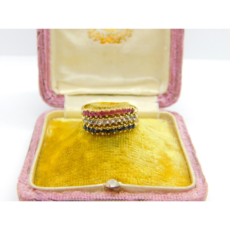 Details: A fantastic and wonderfully designed vintage 14ct yellow gold three layer band ring set with natural ruby & sapphire as well as diamond paste or possibly white topaz to the centre hallmarked 585 to the interior c1970. This is a wonderful item that