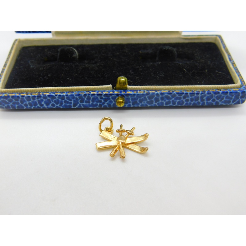 Details: A fantastic and wonderfully designed vintage 14ct yellow gold skiing interest skis and poles charm pendant hallmarked to the bale 585 c1970. This is a wonderful item that would make a perfect gift or addition to any collection. The BOX pictured is