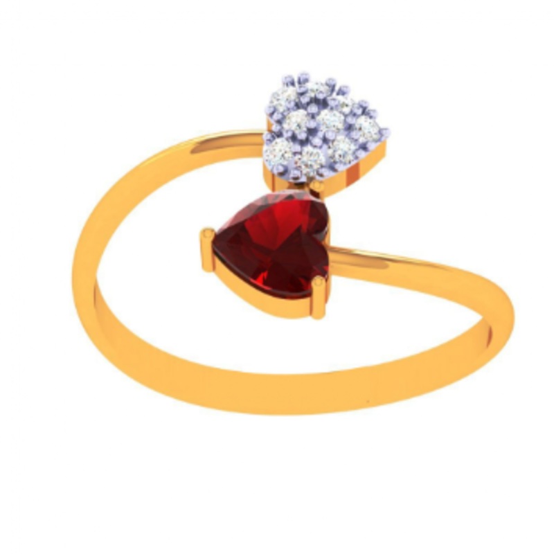 Two hearts embedded with red stone and a cluster of white stones to beautify the look of the ring is a best seller gold ring design for women from our online exclusive valentines collection. The 1.1cm*2.05cm*1.1cm yellow gold ring weights 1.4gm and have BI