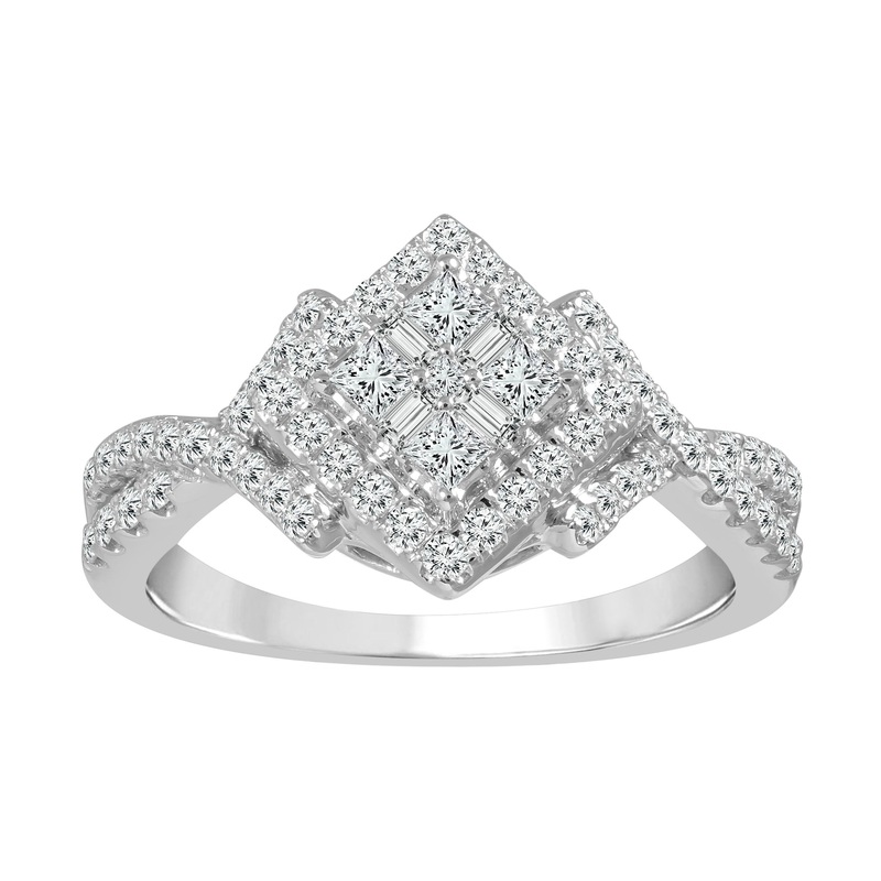 Sideways Princess Shaped Cluster Diamond Ring with Twisted Band