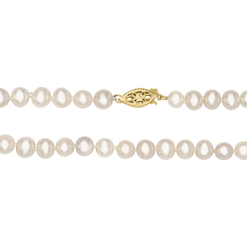 A beautiful and classic design, this pearl strand necklace is a must have! Crafted with 14K yellow gold clasp and 5-5.5mm cultured pearls at 18 inches length.