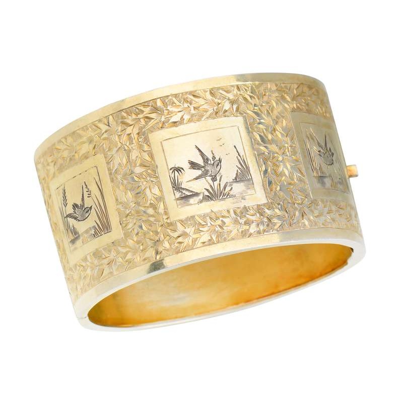 Dating to 1882 and English in origin, the sterling silver wide bangle bracelet is covered in a light wash of gold, often termed vermeil.