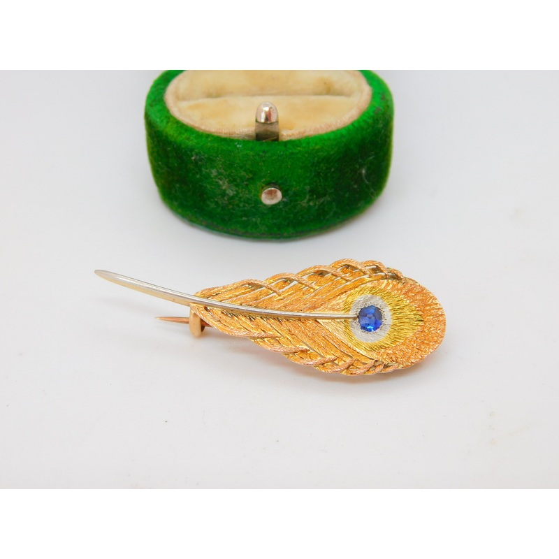 Details: A fantastic and wonderfully designed vintage 18ct tri-colour gold peacock feather brooch set with a central sapphire stone c1980, the gold has been XRF tested as it is unmarked. A charming figurative example. This is a wonderful item that would ma