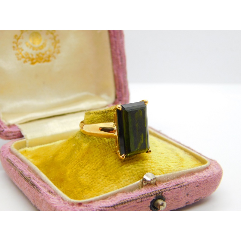 Simply stunning large green tourmaline stone to the centre of this 18ct yellow gold cocktail ring dating from the 1980’s. The gold is marked to the rear of the band. The stone is simply stunning, has been tested as real, is in good order and a fantastic colour please see the pictures approx. 12.5cts in size. A simply stunning and wonderful vintage statement cocktail ring.