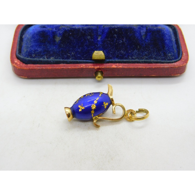 Details: A fantastic and wonderfully designed vintage 18ct yellow gold & blue enamel wine jug charm or pendant with lovely detailing possibly Italian hallmarked to the bale c1980. Very minor chip to the enamel base. This is a wonderful item that would make