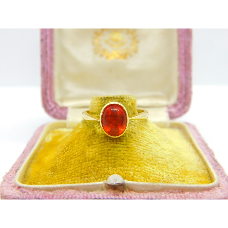 Details: A fantastic and wonderfully designed vintage 18ct yellow gold band ring set with a central cabochon cut fire opal with gorgeous colour hallmarked London 1994 to the inner band. This is a wonderful item that would make a perfect gift or addition to
