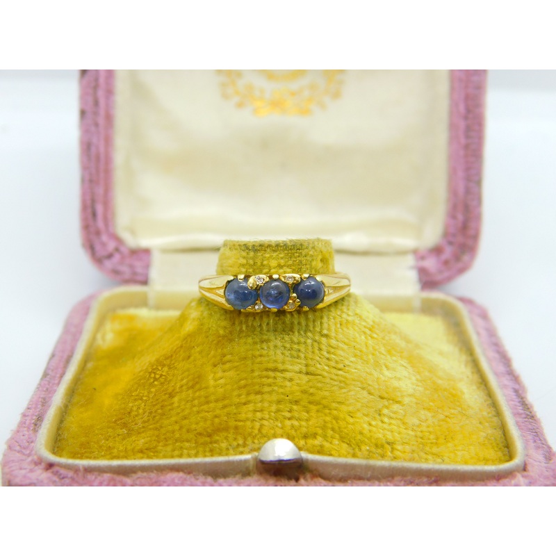 Details: A fantastic and wonderfully designed antique art deco 18ct yellow gold band ring set with cabochon sapphire stones c1920 – the gold has been XRF tested. This is a wonderful item that would make a perfect gift or addition to any collection. The BOX pictured is for PRESENTATION ONLY and is NOT included in the listings but used to frame the pictures unless specifically stated otherwise.