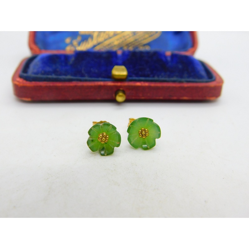 Details: A fantastic and wonderfully designed pair of vintage 18ct yellow gold and carved nephrite jade floral stud earrings hallmarked 750 c1980, one of the butterflies is 18ct and the other is 9ct. This is a wonderful item that would make a perfect gift