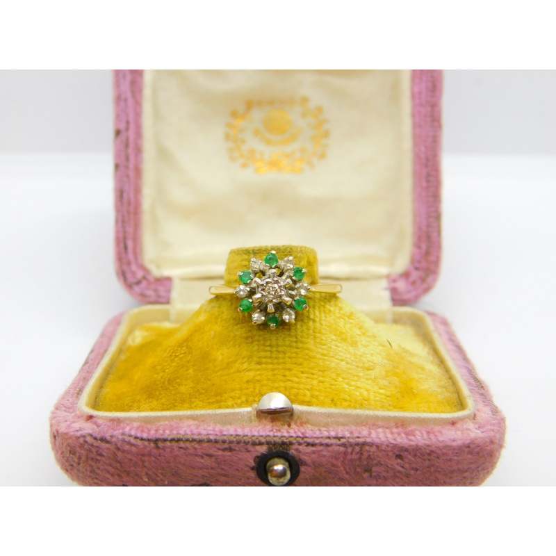 Details: A fantastic and wonderfully designed vintage 18ct yellow gold floral cluster ring set with green emeralds & diamonds hallmarked Birmingham 1973 to the interior, the stones have been tested. This is a wonderful item that would make a perfect gift or addition to any collection. The BOX pictured is for PRESENTATION ONLY and is NOT included in the listings but used to frame the pictures unless specifically stated otherwise.