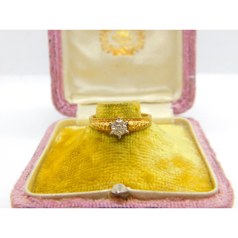 Details: A fantastic and wonderfully designed vintage 18ct yellow gold diamond set bark effect solitaire ring with illusion set diamond hallmarked London 1972 to the interior. This is a wonderful item that would make a perfect gift or addition to any colle