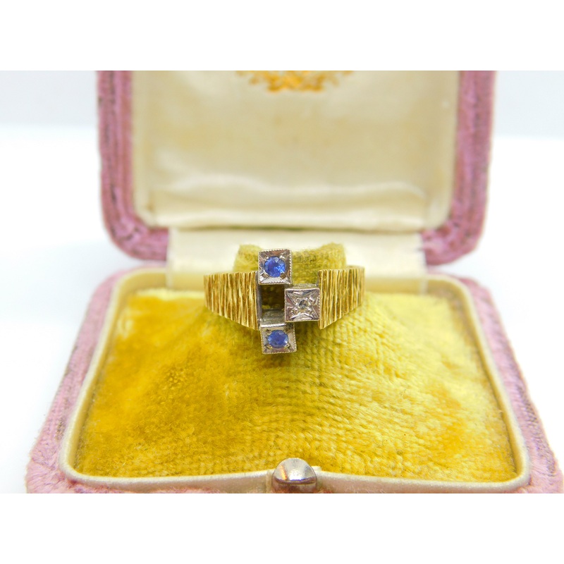 Details: A fantastic and wonderfully designed vintage 18ct yellow gold abstract form statement ring set with sapphire & diamond with lovely textured bark style shoulders hallmarked London 1971 to the interior. This is a wonderful item that would make a perfect gift or addition to any collection. The BOX pictured is for PRESENTATION ONLY and is NOT included in the listings but used to frame the pictures unless specifically stated otherwise.