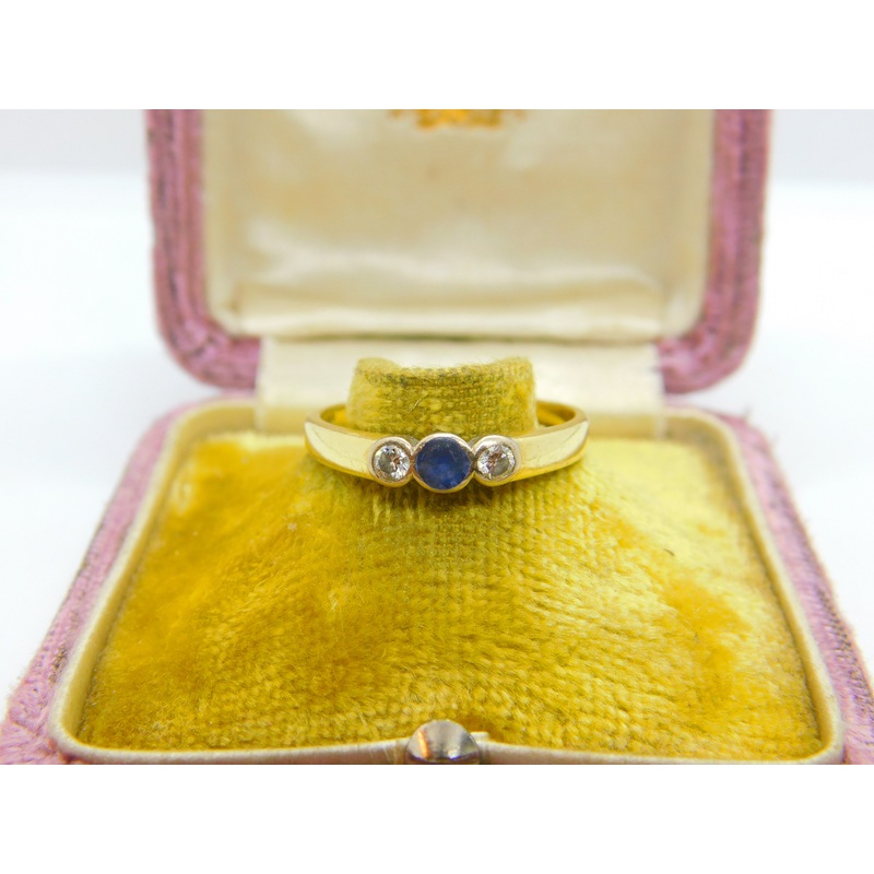 Details: A fantastic and wonderfully designed vintage 18ct yellow gold band ring set with central blue sapphire flanked by diamonds approx. 0.1ct each, hallmarked Sheffield 2000 to the interior. This is a wonderful item that would make a perfect gift or addition to any collection. The BOX pictured is for PRESENTATION ONLY and is NOT included in the listings but used to frame the pictures unless specifically stated otherwise.