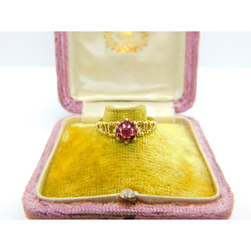 Details: A fantastic and wonderfully designed vintage 18ct yellow gold natural ruby set floral cluster ring with superb textured shoulders hallmarked Birmingham 1974 with an import hallmarked, the stones have been tested. This is a wonderful item that woul