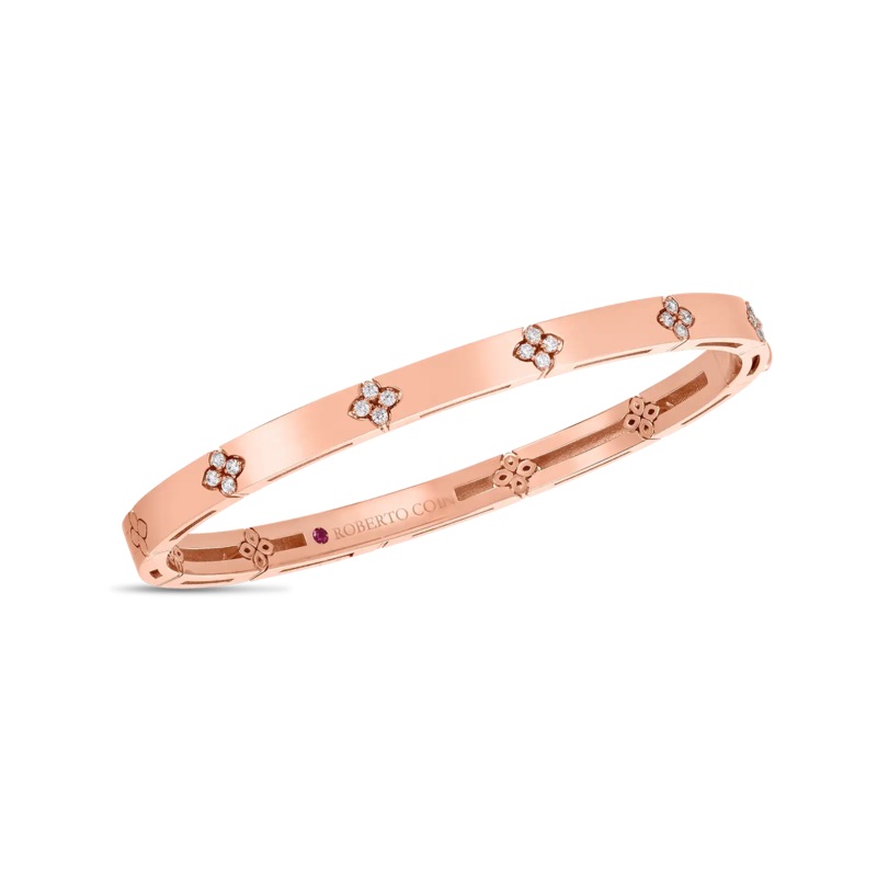 Roberto Coin combines his technological prowess with time-honored craftsmanship to create the new Verona collection. The four-petaled floral motif repeats in diamonds and in engraving, even reappearing in the gallery of each piece as a reminder of our inne