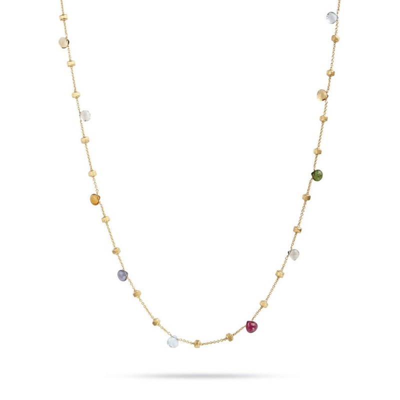 18K-Yellow-Gold- long necklace with tabeez cut multi-colored semi-precious gemstones. A timeless and playful Marco Bicego classic, this Paradise Multicolor Gemstone Necklace is hand engraved by Italian artisans and composed of hand picked stones.ITEM # CB1