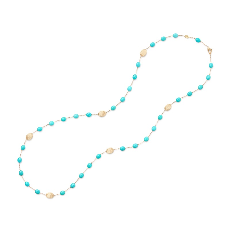 This very feminine sautoir alternates tiny 18K yellow gold oval beads, finely hand engraved using the ancient Florentine technique, with charming oval cabochon turquoise gemstones. Elegant and sophisticated, it can add a vibrant flair to any ensemble.Lengt