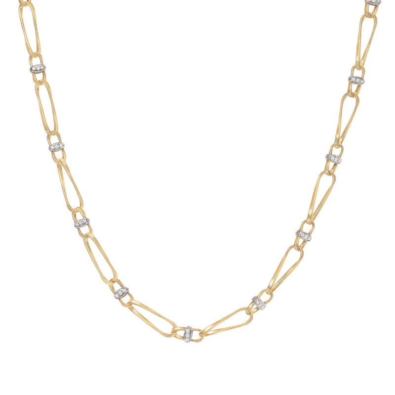 In this elegant collar, fine 18K yellow gold strands crafted with our exclusive coil technique create captivating figure-eight shapes, joined together with pave diamonds to gently capture and reflect natural light.Length: 18 inchesYellow & white goldDiamon