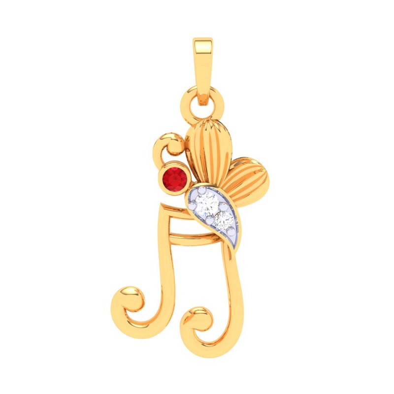 A beautiful light weight gold pendant from Diamond Collection.The pendant in the shape of musical note has a little butterfly with one red & two white stones.
