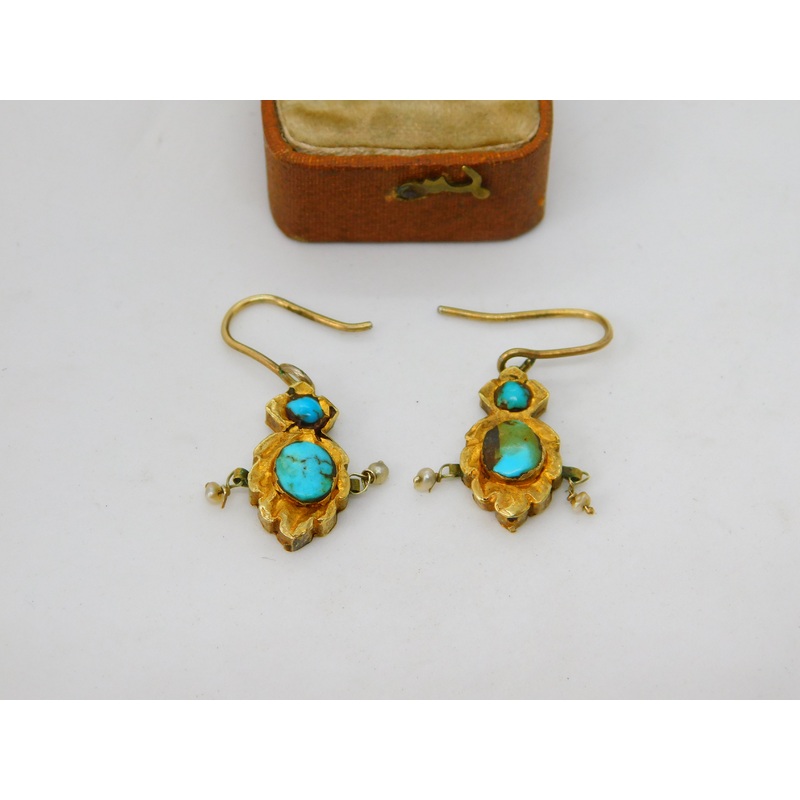 Details: A fantastic and wonderfully designed antique early Austro 18ct yellow gold foil drop earrings set with natural turquoise and pearls the edges c1780, the gold is worn to the backs please study pictures. The gold has been XRF tested. This is a wonderful item that would make a perfect gift or addition to any collection. The BOX pictured is for PRESENTATION ONLY and is NOT included in the listings but used to frame the pictures unless specifically stated otherwise.