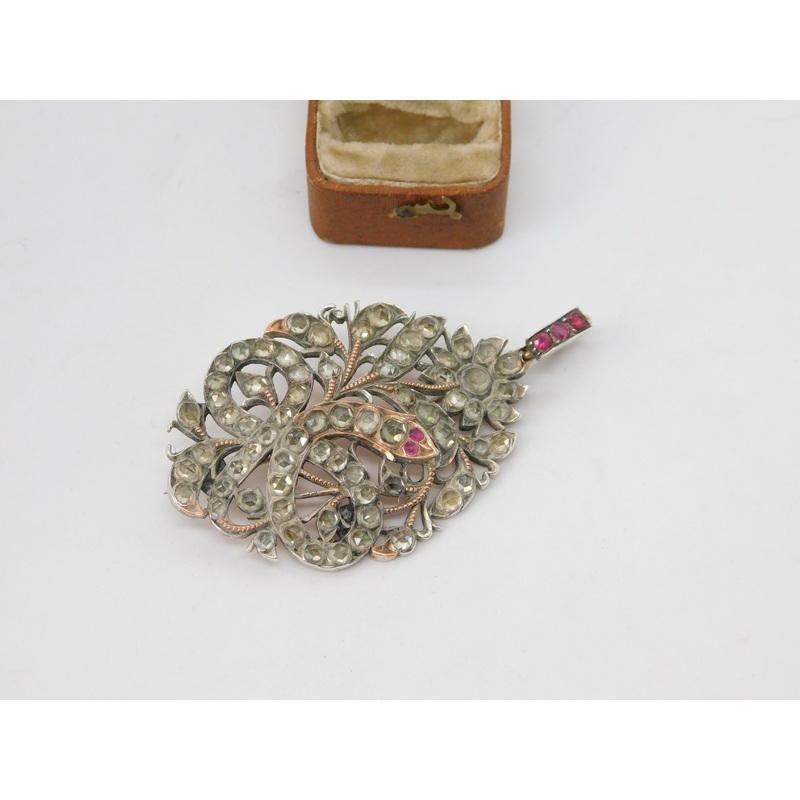 Details: A fantastic and wonderfully designed antique 18th century Indian mughal large coppered sterling silver pendant in the form of a entwined serpent in leaves set with rock crystal and natural rubies c1780. The silver has been tested as it is unmarked