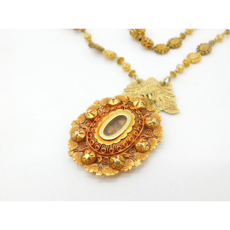 Details: A fantastic and wonderfully designed 18th century Spanish colonial Philippines 18ct yellow gold devotional necklace crafted from over 150 beads each with stunning workmanship; the item finished with a superb reliquary glass floral pendant c1750. F