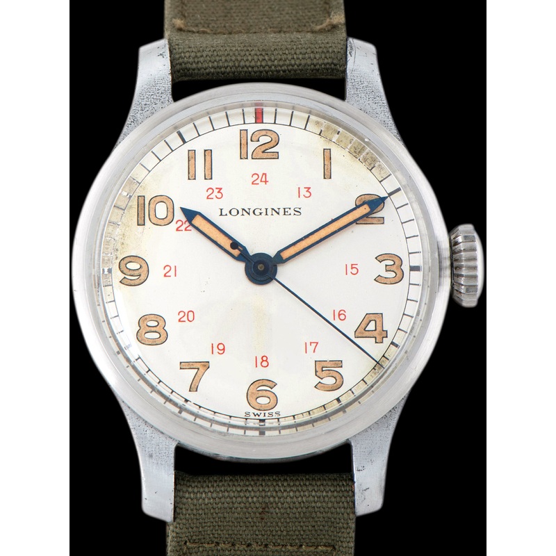 The ref. 5150 is an iconic model from Longines, renowned for its elegant yet functional aesthetic, and for being both a military-issued and civilian model from the height of the Second World War. The classic navigator-style dial displays the time in both 12-hour and 24-hour scales in a very legible and organized fashion, for telling the time at a glance. The case, while measuring smaller is size at 32mm, is fashioned with long swooping lugs that extend the size of the watch to a more modern aesthetic. A stylish, yet still classically elegant timepiece ready for its next adventure.