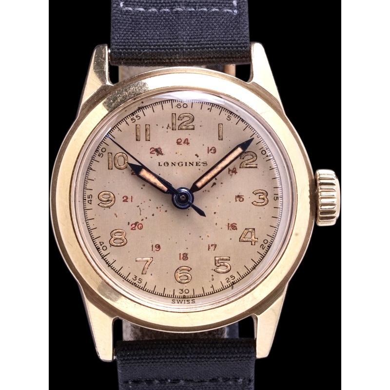 This Longines is powered by Longines caliber 10L manual wind movement. A beautifully designed and handsome vintage military-style model with a robust 14k yellow gold design that features a 24 hour dial and oringal blued-steel hands.