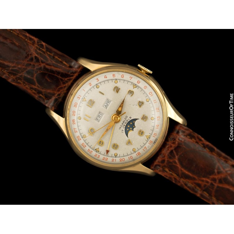 Our triple calendar with moonphase Bidynator powered beauty has a full sized 14K case which is the same size as a Rolex Datejust. It is in gorgeous original condition and has never polished. The facets and lines are crisp. Our photos couldn’t begin to do it justice.