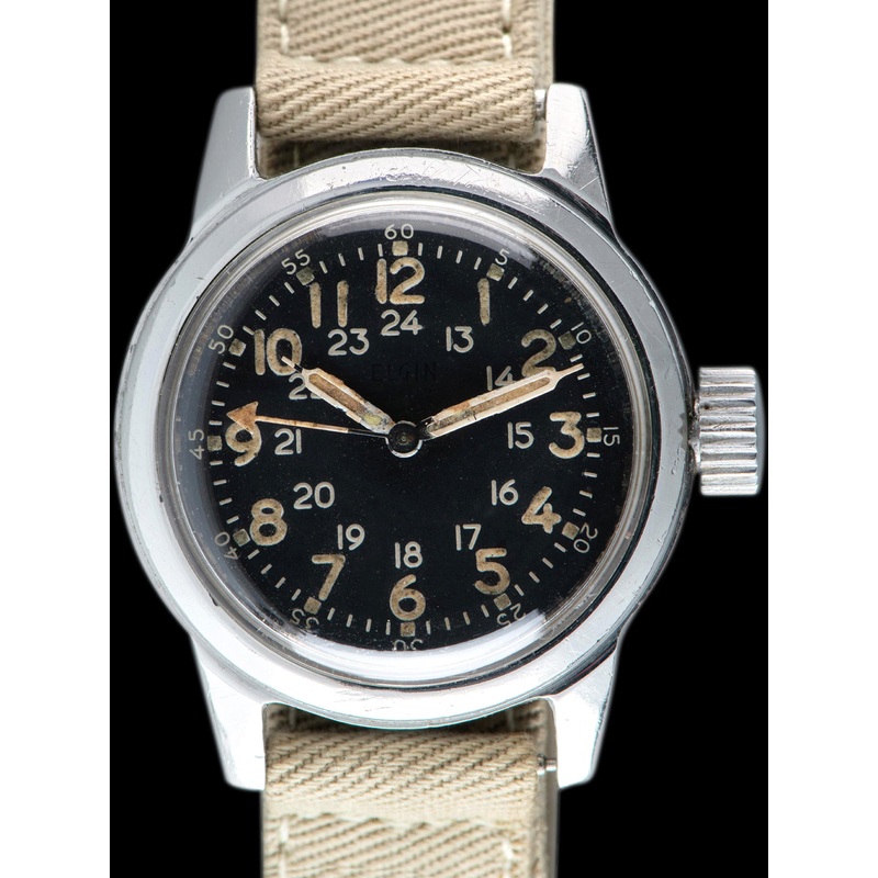 The Elgin Type A17A is a U.S. Military issued navigator/pilots timepiece that was in production from 1956-1962, which immediately replaced the previous mil-spec A-17. The A17A was designed as a navigation timepiece for pilots and aviators. The A17A is very similar to the A-17, featuring radium Arabic numerals, lumed pencil-style hands, and a subsidiary 24-hour track. However, the main difference is the 18-jewel Elgin movement