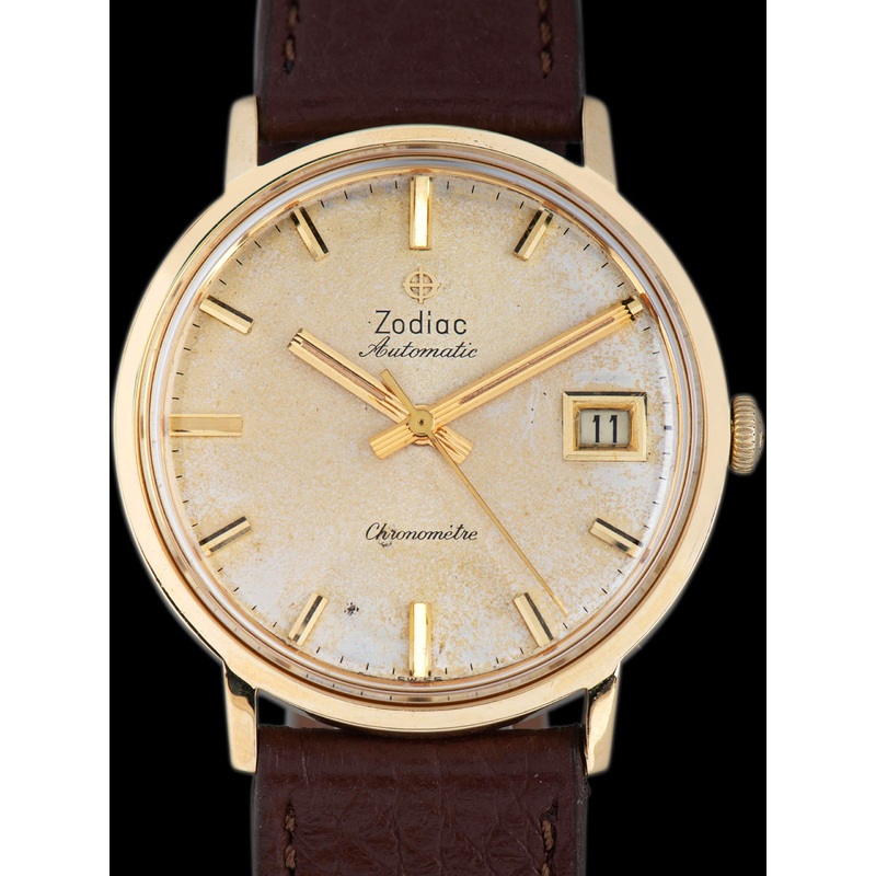 The originally silver dial has patinated to a “tropical” champagne color that adds to the vintage nature of the watch. The hour markers, hands, Zodiac logo, and even date window are all gold, which offers a regal quality. The inlaid gold enamel on the hands adds to the watch’s sophisticated presence and remains fully intact.
