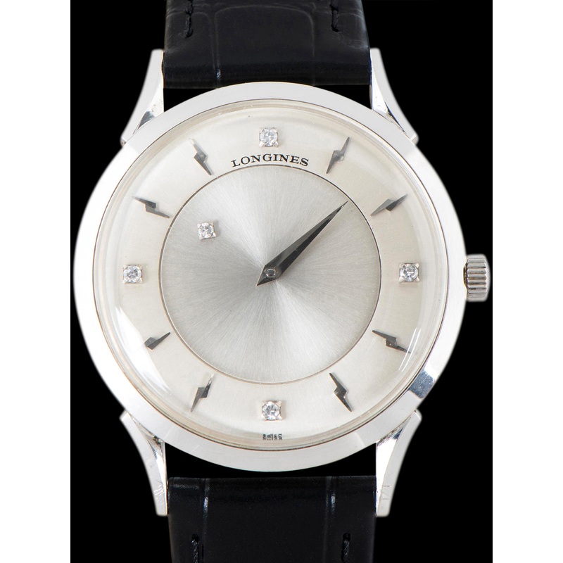 The beautiful 14k white gold case remains in exceptional condition, showing minimal signs of use with no notable evidence of being previously polished. The crown is signed with the Longines logo and remains original to the watch. The case back retains all of the factory markings in crisp condition. The watch comes supplied on a 2pc black leather strap.