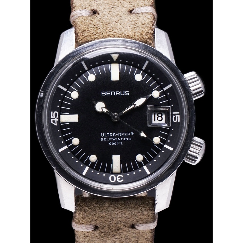 The excellent super-compressor case retains factory chamfer and shows honest signs of use. The case retains its original twin crowns, showing the iconic super compressor cross-hatched texture. The original crystal with integrated cyclops is in wonderful condition. The case back still lightly, displays its original factory engravings. The watch will come supplied on a 2pc handmade leather strap.
