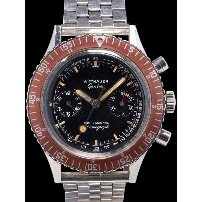 Vintage Wittnauer chronographs have been growing in popularity among vintage collectors. Specifically,the Wittnauer chronograph reference 7004A. Thisgreat example possessessome key elements that make it highly desirable including its 40mm case size, lollipop sweep seconds hand, and a unique and eye-catchingburgundybezel. The simple and clean dial displays a tachymeter and a regatta countdown in the rightmost subdial. The Manual-wound Landeron cal. 248 chronograph movement is a workhorse and a favorite among manual wind chronograph fans.