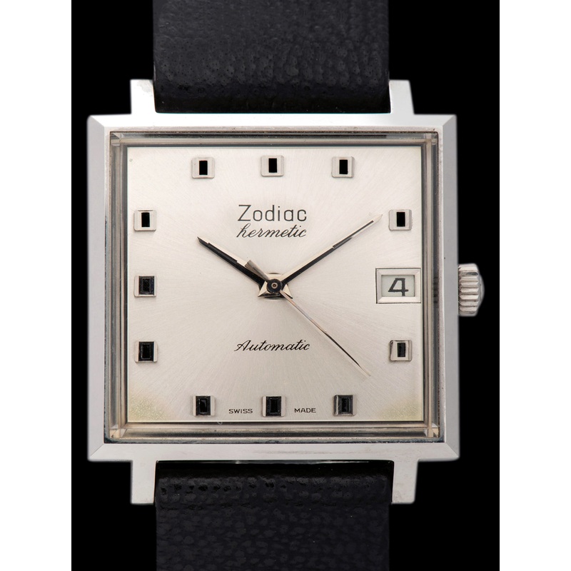 Stock # ZHA722927 Brand Zodiac Style Hermetic Automatic Model 722-927 Serial N/A Size Men’s Material Stainless Steel Dial Silver Millimeters 30X30 Bracelet 2pc Zodiac Black Leather Strap W/ Zodiac Buckle