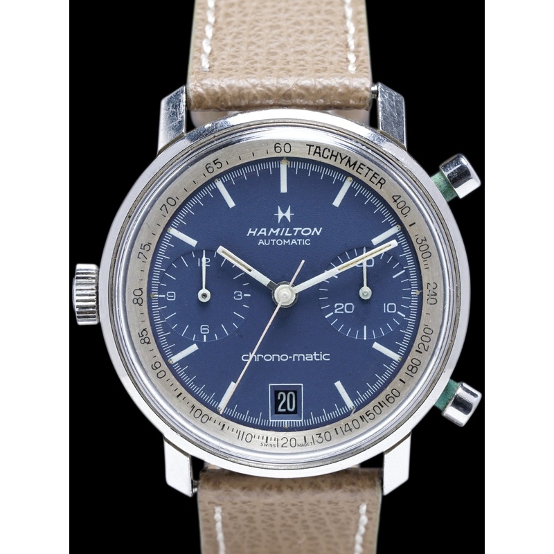 In addition to being one of Hamiltons most famous and best-looking chronograph models of all time, the Chrono-Matic ref. 11002-3 also holds the distinction of being one of the worlds very first automatic chronograph watches, as it debuted in 1969 – the very same year that the first self-winding chronograph movements were making their inaugural appearances. Featuring a two-register layout, a date display at 6 oclock, and an integrated micro-rotor design, the Cal. 11 represented a major step forward for the world of chronographs and the Hamilton Chrono-Matic ref. 11002-3 is easily one of the most important models from the brands archives.