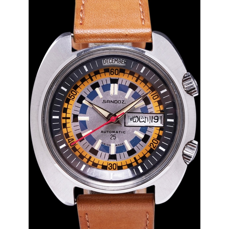 The strong, unpolished case remains in excellent condition, with very light signs of honest use and sharp edges. The interior black bezel reveals no signs of age. The original faceted crystal shows minimal signs of wear. The case retains its original twin “Sandoz” signed crowns. The casebackretains a partially worn-off factorysticker and all engravings are fully intact and legible. The watch comes on a two-piece hand-made leather strap.