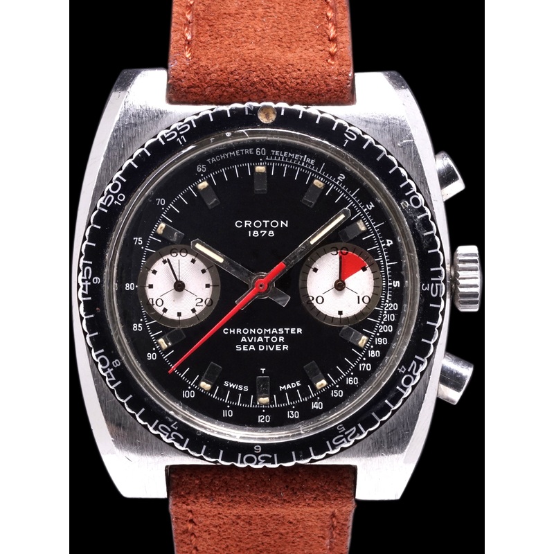This Croton 106 Chronograph ref. 903011 features a beautiful and intricate dial designed by Singer and most notably features the same sub-dial printing as the famous “Paul Newman” Rolex Daytona dial which was also made by Singer. These incredibly rare examples have excellent art-deco styling and they’re large case design for the era makes them an easy to wear option by today’s standards. Powered by the Landeron cal. 248 chronograph movement, this Croton 106 Chronomaster is a durable choice for daily wear.