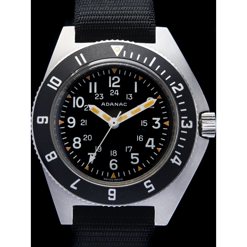In the late eighties, both the USAF and Canadian Armed Force issued these tough-looking Adanac watches to their service members.Adanac is (Canada spelled backward) and was produced in the joint contract between Gallet and Marathon. The watch has an unusual 0-11 marked bidirectional bezel, which makes it look like a hybrid of diver’s and pilot’s watches. Both the United State air force and the Canadian Armed Forces issued the Adanac watches in the late 1980s. The Adanac possesses an asymmetrical case that possesses a screw-down crown, has fixed bars, and is water-resistant to 660 feet, which qualifiesthis watch as a military diver’s watch although it seems to have been issued more commonly to aircrews. The dial maintains 24-hour markings commonly found on many military watches. The hour and minute hands have applied tritium luminous material as do the hour indexes on the dial and the zero position on the bezel is also tritium coated. The Adanac uses a Swiss-made quartz movement and there is a separate latch (which you can open with a coin) for replacing batteries.