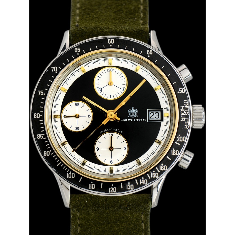 Thestainless steel case appears to have been gently polished and is in great condition, showing almost no signs of use. It retains its original Hamilton-signed crown and pump-pushers. The fixed “Units Per Hour’ bezel is in fantastic condition remaining highly legible with minimal signs of use. The case back is clean with limited wear and the factory markings all remain fully intact. The watch will be supplied on a 2-pieceleatherstrap.