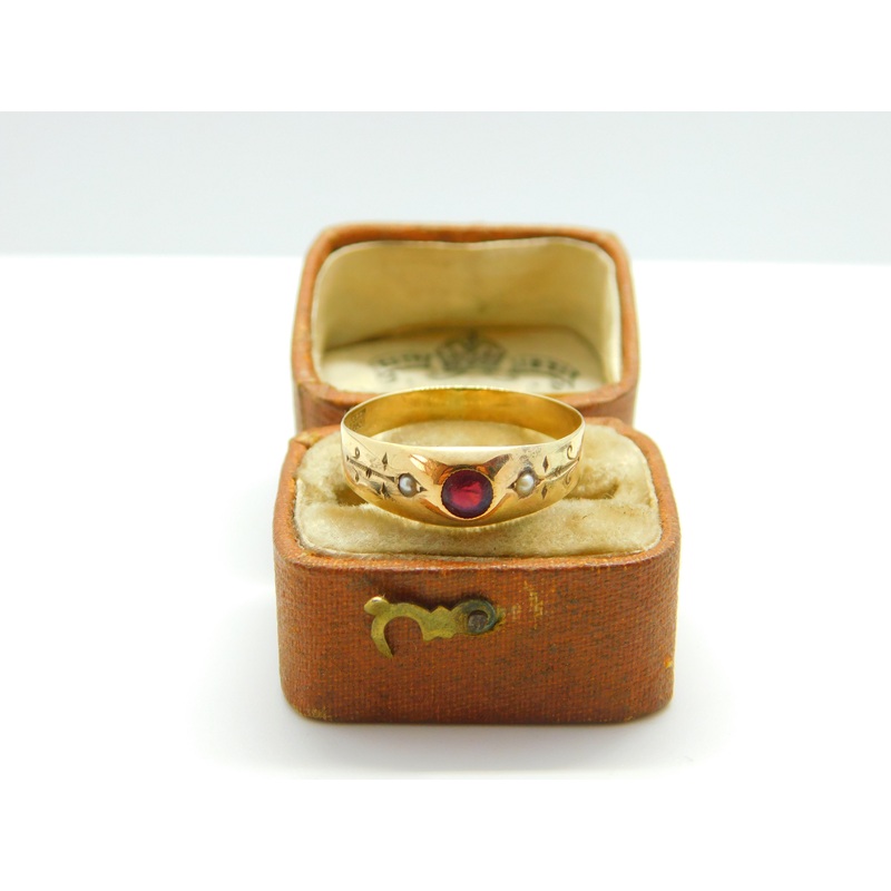 Details: A fantastic and wonderfully designed antique 19th century 8ct or .333 band ring set with central garnet flanked by seed pearls hallmarked to the interior band c1860, almost certainly Austrian. This is a wonderful item that would make a perfect gif