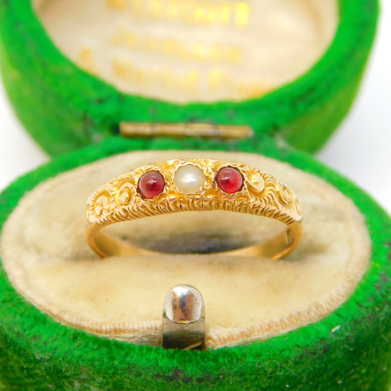 Details: A fantastic and wonderfully designed antique 19th century French 22ct yellow gold dress ring set with two garnets flanking a central pearl hallmarked to the interior and XRF tested c1860. This is a wonderful item that would make a perfect gift or addition to any collection. The BOX pictured is for PRESENTATION ONLY and is NOT included in the listings but used to frame the pictures unless specifically stated otherwise.