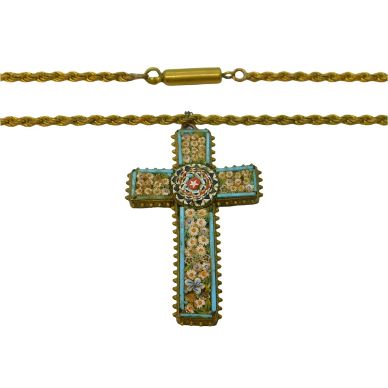 Details: A fantastic and wonderfully designed antique Victorian gilt metal Italian micro mosaic cross pendant necklace c1860 with lovely colour. This is a wonderful item that would make a perfect gift or addition to any collection. The BOX pictured is for