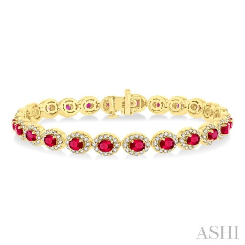 Fit for royalty, this majestic precious tennis bracelet is certainly a piece of jewelry to vie for. It is beautifully designed and elegant, and is the kind of bracelet every woman dreams of owning. It features 24 oval shape mounts, set neatly in a tight link, with each mount embellished with a 4X3 MM oval cut Ruby each, total 24 rubies in all. Each of these rubies is attractively haloed by 12 each prong set round cut diamonds, 188 diamonds altogether. An open box clasp with push-release, completes the precious tennis bracelet, which is styled in a 14 karat yellow gold. Total diamond weight is 2 1/6 ctw.