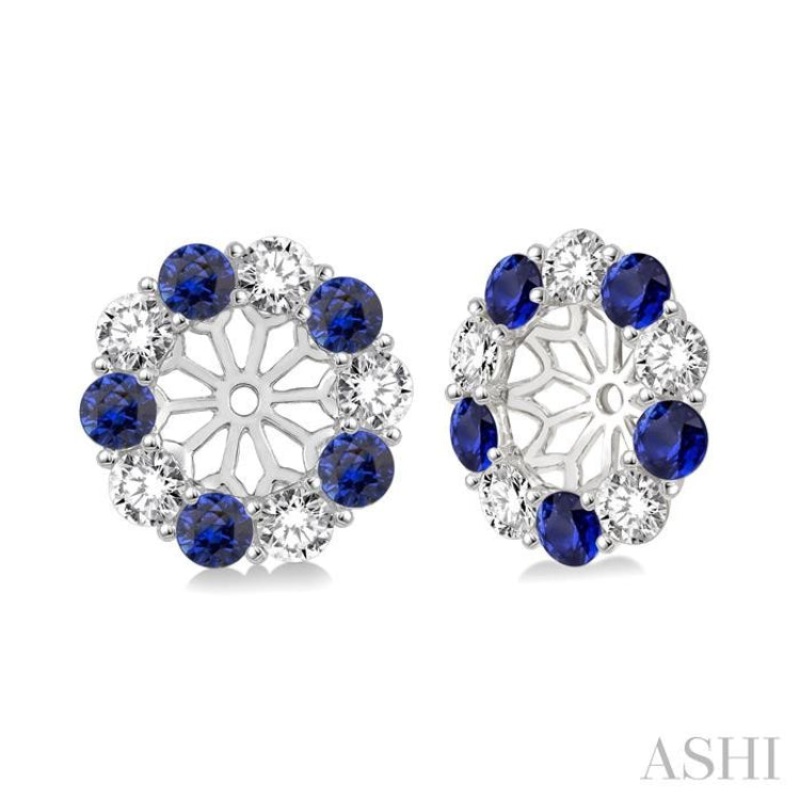 Make your own style statement with this pair of beautifully designed Sapphire and diamond earring jacket. Styled in glinting 14 karat white gold these open work floral designed earrings are graced with a stream of 20 prong set round cut Sapphire and diamonds accents, beautifully set on the outer line of the earrings. These Sapphire and diamond earring jackets surround your ordinary diamond studs with a brilliant floral pattern. Total diamond weight is 1/2 ctw and Sapphire measures 2.30 MM.