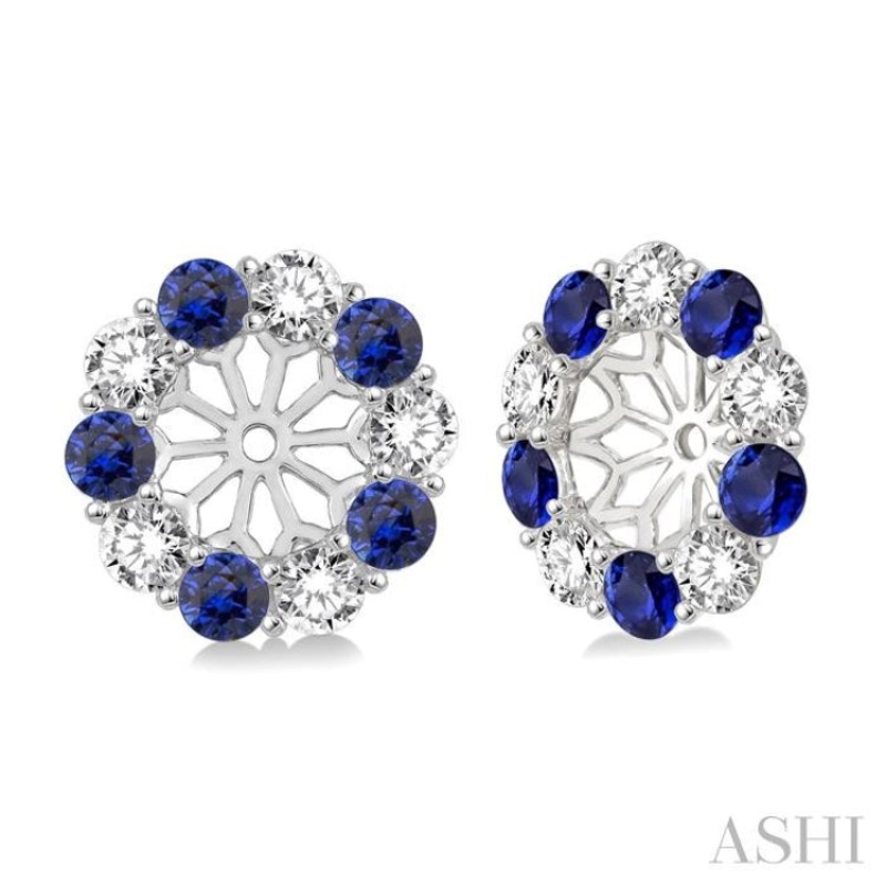 Make your own style statement with this pair of beautifully designed Sapphire and diamonds earring jackets. Styled in glinting 14 karat white gold these open work floral designed earrings are graced with a stream of 20 prong set round cut Sapphire and diamonds accents, beautifully set on the outer line of the earrings. These Sapphire and diamond earring jackets surround your ordinary diamond studs with a brilliant floral pattern. Total diamond weight is 3/4 ctw and Sapphire measures 2.65 MM.