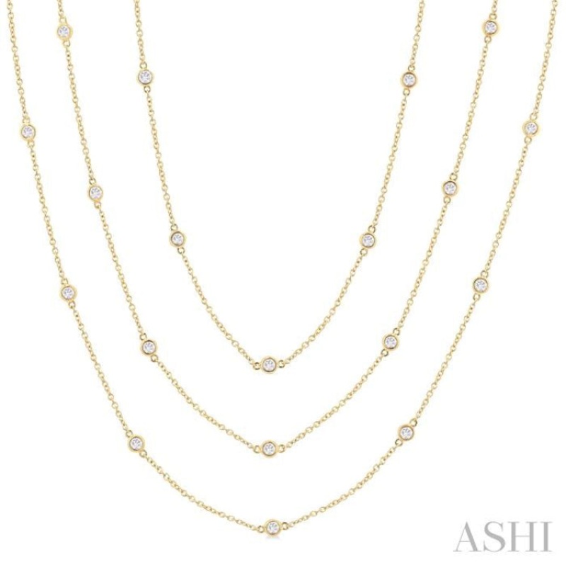 Indulge in luxury with this glamorous diamond long station necklace, which is a grand addition to your jewelry collection. Versatile and stylish, the necklace can be worn in multiple ways. Whether worn as a single long chain for a sleek and sophisticated look or twisted into layers for added volume and dimension, it effortlessly elevates any ensemble. The necklace features a stunning layout of 50 bezel set round cut diamonds adorning the stations of the 60-inch long Cat-30 Chain, creating an eye-catching effect. A polished finish 14 karat yellow gold body adds a touch of refinement and elegance. Total diamond weight is 2 ctw.