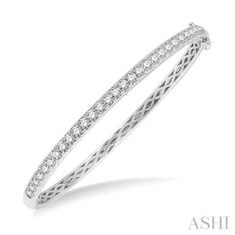 A sleek bangle with diamond embellishments, this lends a delicate, attractive look to the wrist. The top half of the bangle hemisphere is skillfully decorated with tiny round cut diamonds, while the lower half is left plain. There is a total of 29 pave set round cut diamonds adorning the top surface of the bangle. Styled in charming 14 karat white gold, this diamond bangle can easily draw your attention to it. Total diamond weight is 2 ctw.