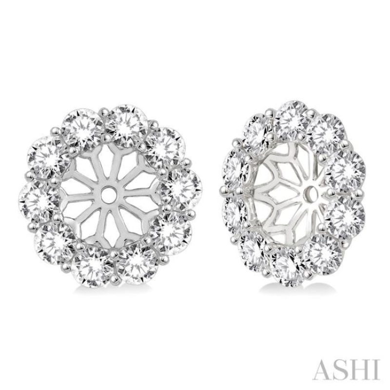 Make your own style statement with this pair of beautifully designed diamond earring jackets. Styled in glinting 14 karat white gold these open work floral designed earrings are graced with a stream of 20 prong set round cut diamonds accents, beautifully set on the outer line of the earrings. These diamond earring jackets surround your ordinary diamond studs with a brilliant floral pattern. Total diamond weight is 2 ctw.
