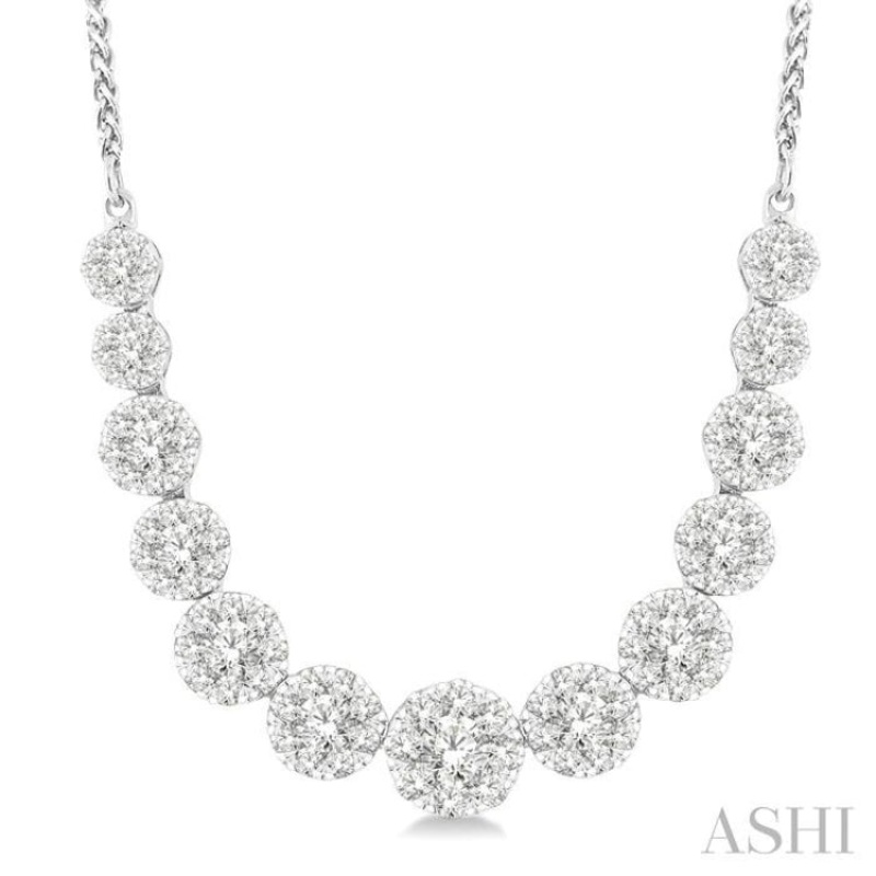 This scintillating, fresh and timeless diamond Lovebright necklace will complement your sweetheart’s look and style. Fashioned on luminous 14 karat white gold with a wheat chain and a lobster lock, this lavish necklace showcases shimmering 117 round cut diamonds that are set in a beautiful complementary array motif. Diamonds are perfectly invisible set. Total diamond weight is 2 Ctw. Fastens with a secure clasp.