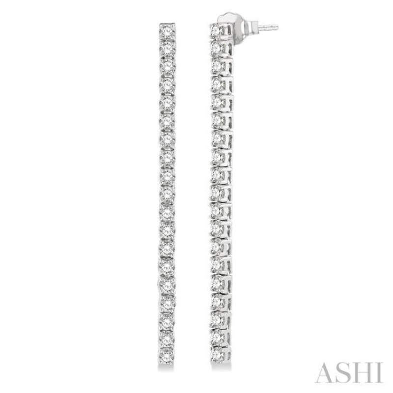 A lovely pair of diamond tennis earrings, these offer a simple design, but a showy look. The earring features 19 tiny round mounts, dropping down the top, embellished with round cut diamonds. 19 each prong set round cut diamonds, total 38 on the earring pair, decorate the round mounts. A push-back earnut closure offers ease of wear. The diamond tennis earring is designed in a rhodium finish 14 karat white gold. Total diamond weight is 2 ctw.